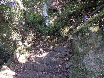 下りが終わるとベンチが置かれた広場の五合目で、ここから南峰まで丸太の階段が続きます。