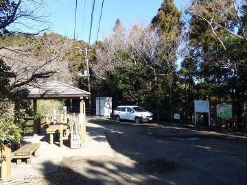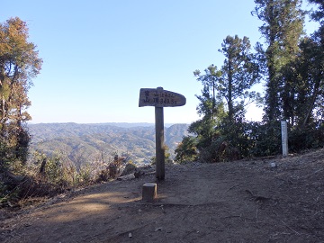 南峰から仁王門跡へ戻り、北峰へ向かいます。 緩やかな道を歩くと分岐で、左は伏姫ノ籠窟への下り、北峰へは右へ進みます。 ボタンスギの巨木と愛の鐘をすぎるとあづまやが建つ広場で、伊予ヶ岳への車道が右へ下っています。 ここでも竹の杖を借りたり返却することができます。