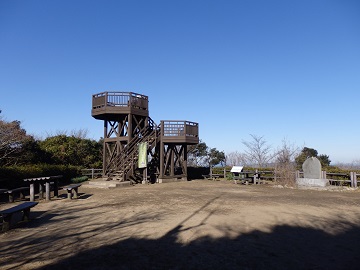 あづまやからは階段をひと登りすれば北峰で、右に標高349.5mの富山山頂、奥は広場で展望台が建っています。