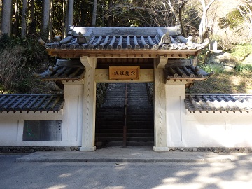 あづまやの先の分岐まで戻り、伏姫籠穴へ下ります。 林道に出るまでずっと急な階段なので、ひざに負担がかからないように下ります。 林道を歩き、堰堤をすぎると伏姫籠穴(ふせひめろうけつ)の白壁の山門です。