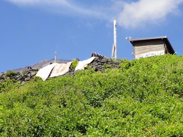 爽やかな天候なので、山小屋を囲む石垣には布団が干され、その上に山頂が見える。