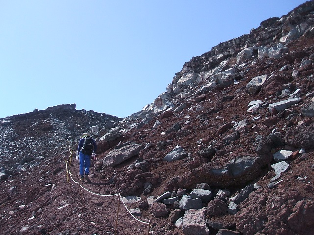 本八合目から山頂へは傾斜の急な岩の道が続く。酸素が不足しているらしく、目まいとあくびが頻繁になってきたので、体を慣らしながらゆっくり歩く。