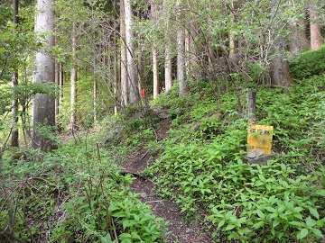 右に塩水川を見ながら、塩水林道を50分ほど登っていくと、カーブミラーの下にワサビ沢出合と書かれた小さな道標があり、ここから登山道に入れば林道をショートカットできます。 登山道に入って堂平沢を渡るとワサビ沢に出合いますが、すぐに左の道に入って、2つの沢の間の道を登っていきます。