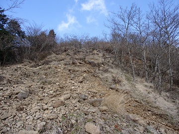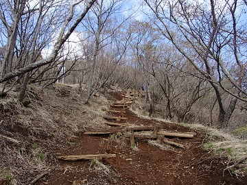 登山道に入って登っていくと、未舗装の林道を横切ります。林道を下っていけば菩提峠です。 再び山道に入ると、赤土の荒れた道を丸太の階段で登ります。 やがて樹林から出ると、ザレた登りとなり、振り返ると大山などを見渡せるようになります。